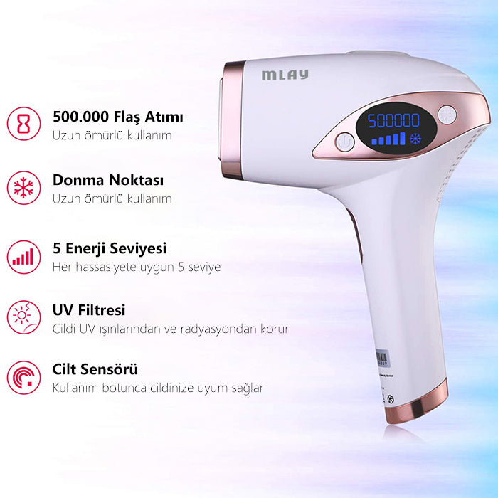 The device has an exceptionally painless performance that provides permanent hair removal results thanks to its high-efficiency laser technology that makes the hair grow slower and less dense. It also stimulates collagen production, contributing to increased skin freshness and the reduction of wrinkles and dark spots. The device has a cooling feature of up to 10 degrees Celsius on its head, which reduces irritation and pain during use. The device has a long life of up to 500,000 flashes, ensuring long-term use and durable quality. Since the device works with a cable, it does not require charging, allowing you to use it continuously and without interruption.